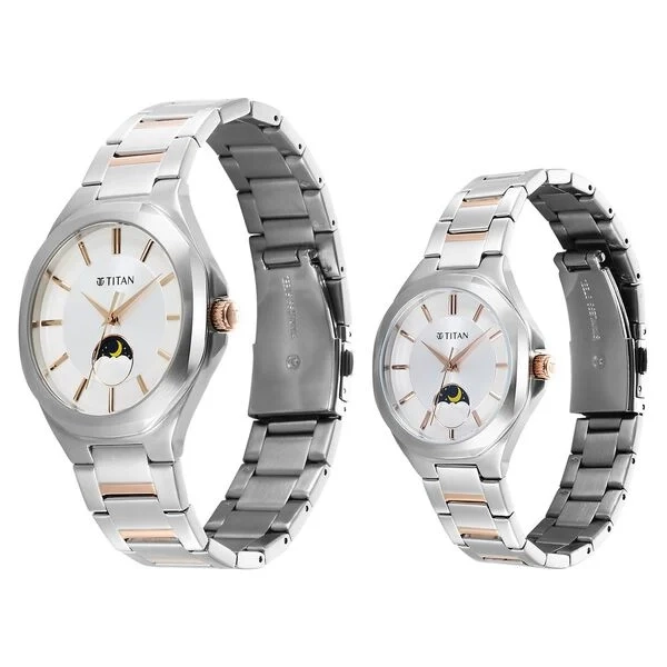 Titan Bandhan Quartz Analog Sun-Moon Silver Dial Two Toned Stainless Steel Strap Watch For Couple